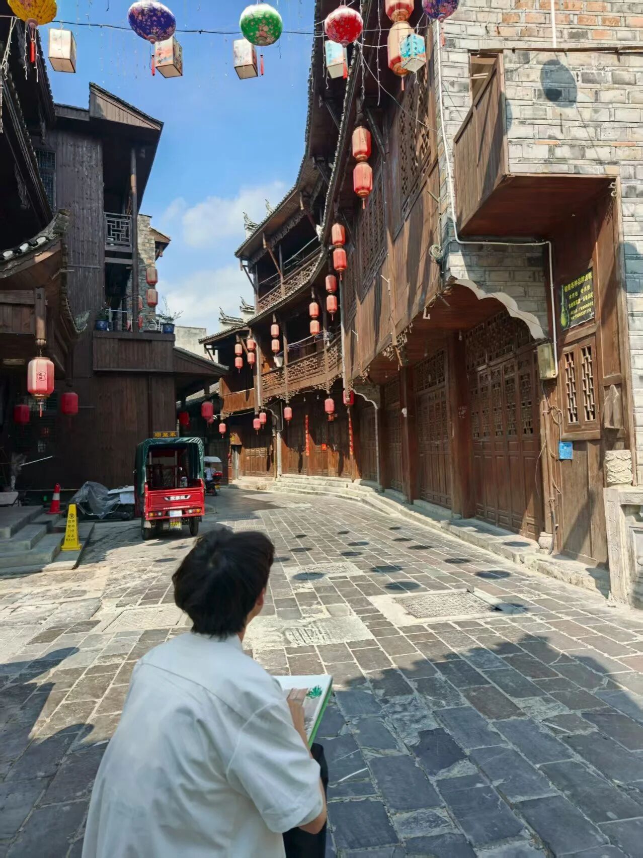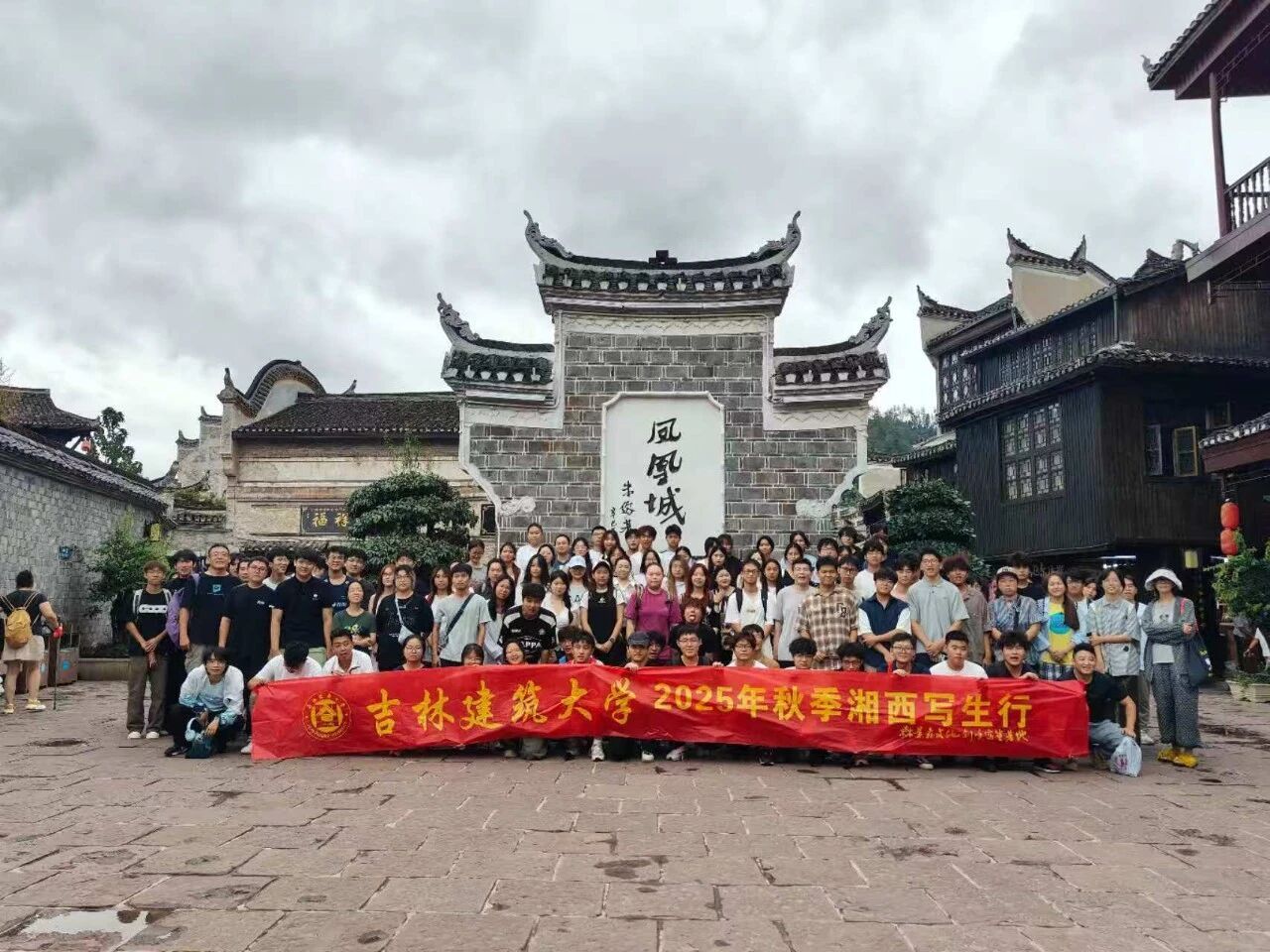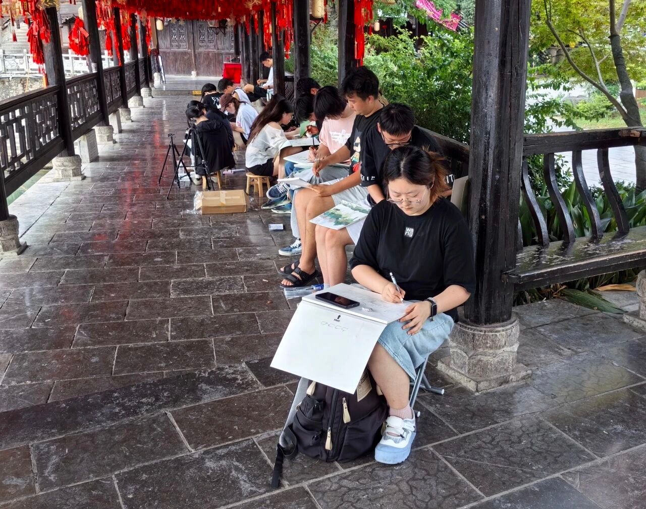 9月1日,写生团队首先抵达湖南长沙,在湖南省博物馆的参观中,同学们系统了解湖南历史文化与民俗特色,为后续写生积累了丰富的文化素材。当晚,团队抵达此次写生首站——湘西“边城”。作为文学大师沈从文笔下《边城》的原型地,这里“一脚踏三省”的独特区位、逶迤的城垣、悠悠的河水与古色古香的吊脚楼,让同学们充满创作期待。在沱江岸边,大家专注捕捉吊脚楼的建筑结构,用画笔还原山城的灵动与雅致。