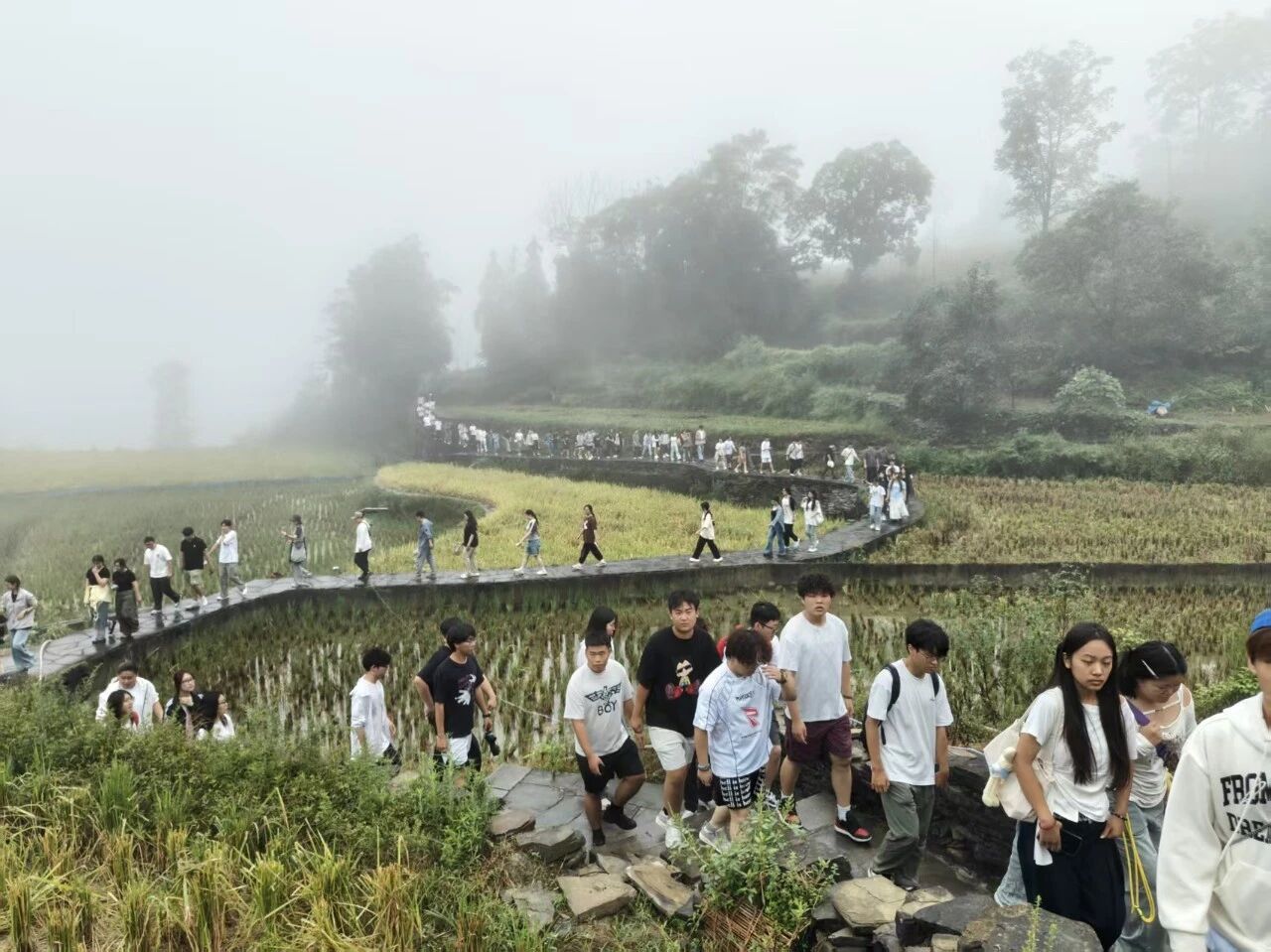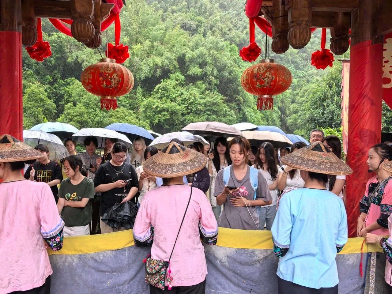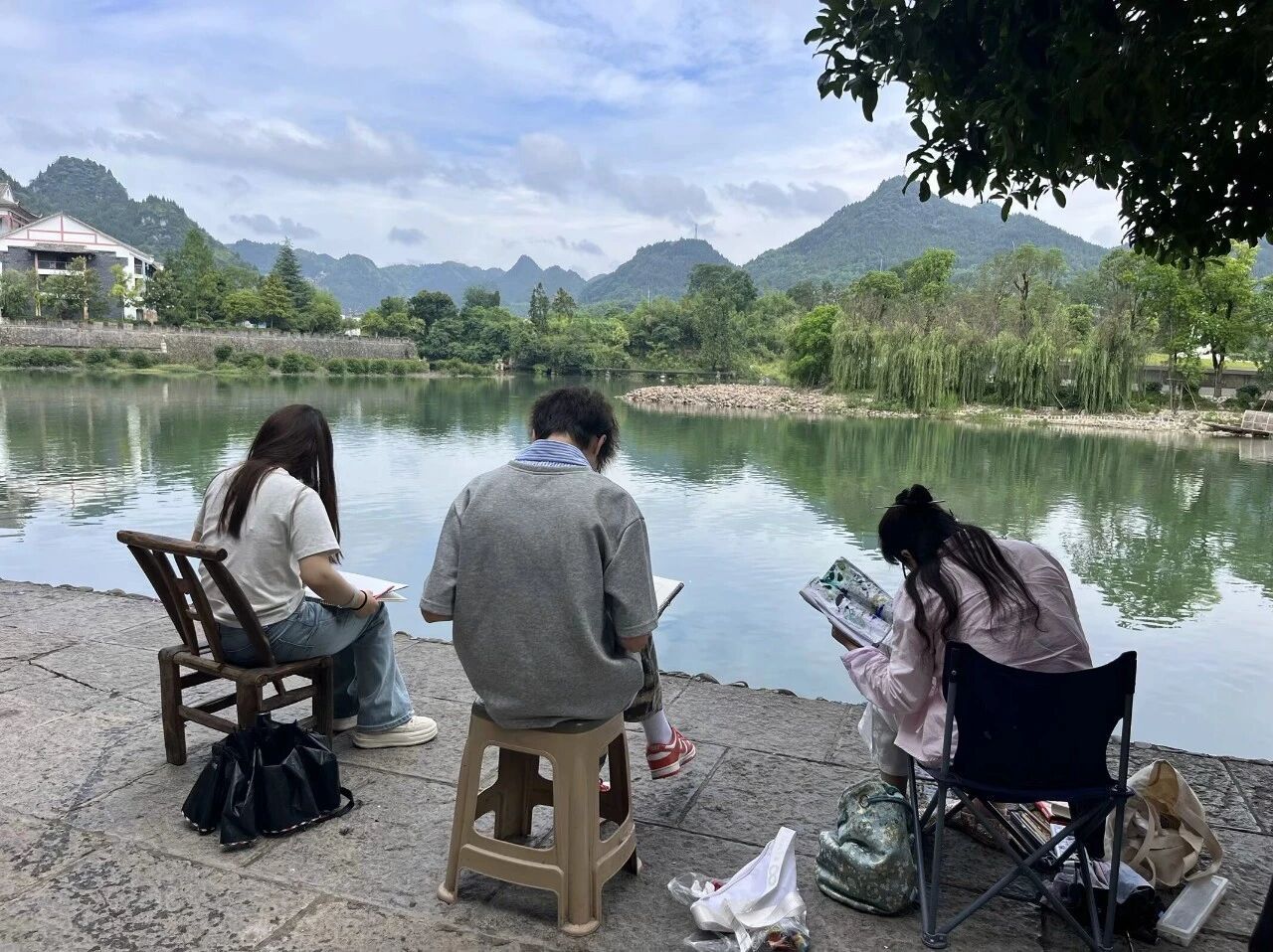 在写生最后两站——德夯苗寨与吉斗苗寨,同学们深入体验苗族文化。德夯苗寨依山而建,灰瓦木屋、石板路桥在翠谷中相映成趣,师生们还在午餐时体验了苗族特色长龙宴;坐落于山峰之巅的吉斗苗寨,有着“山鹰背上的寨子”之称,喀斯特岩溶峡谷地貌与浓郁的苗族习俗相得益彰,苗歌、苗舞、苗家生活场景,为同学们的民间艺术考察提供了生动样本。