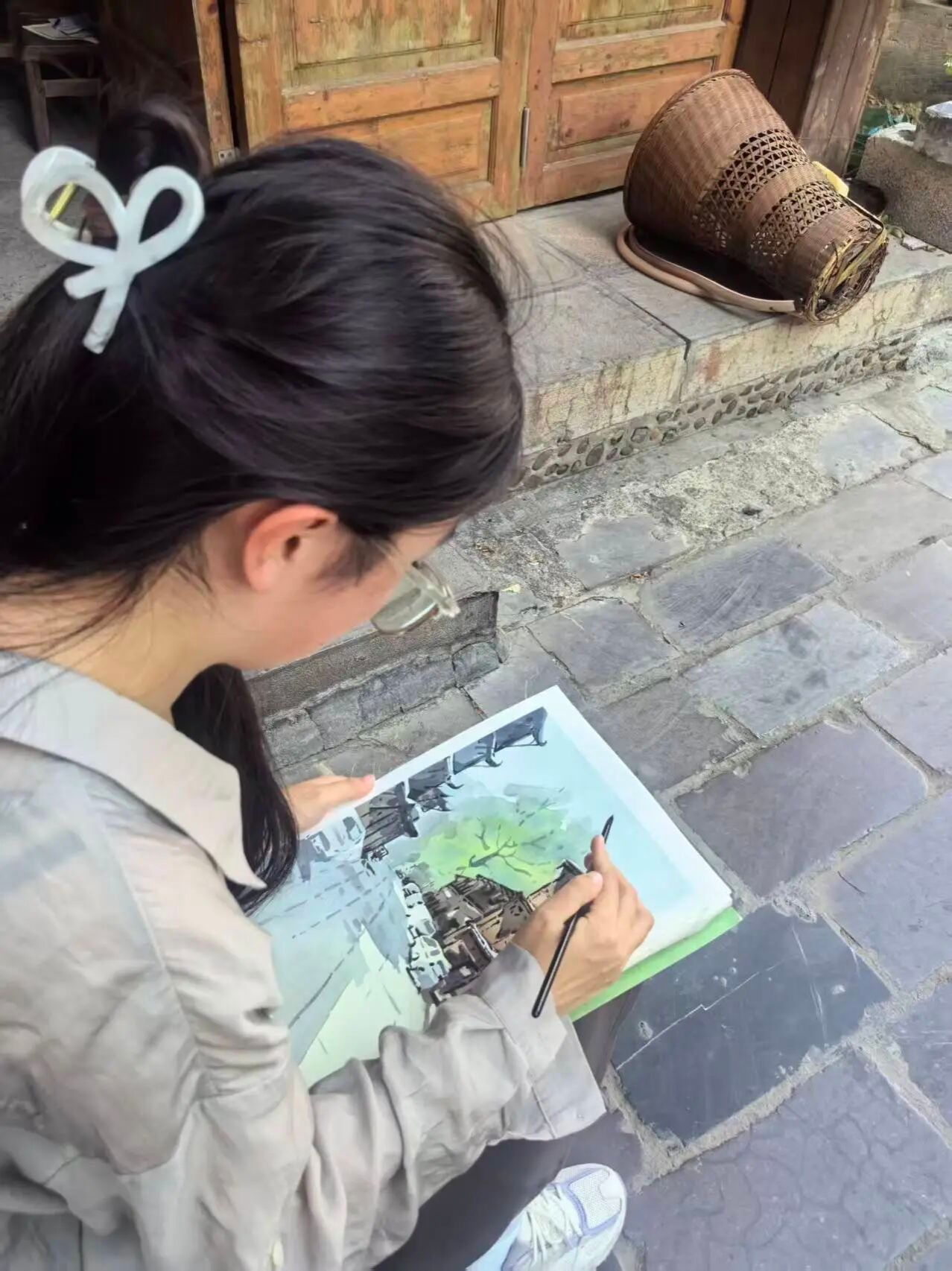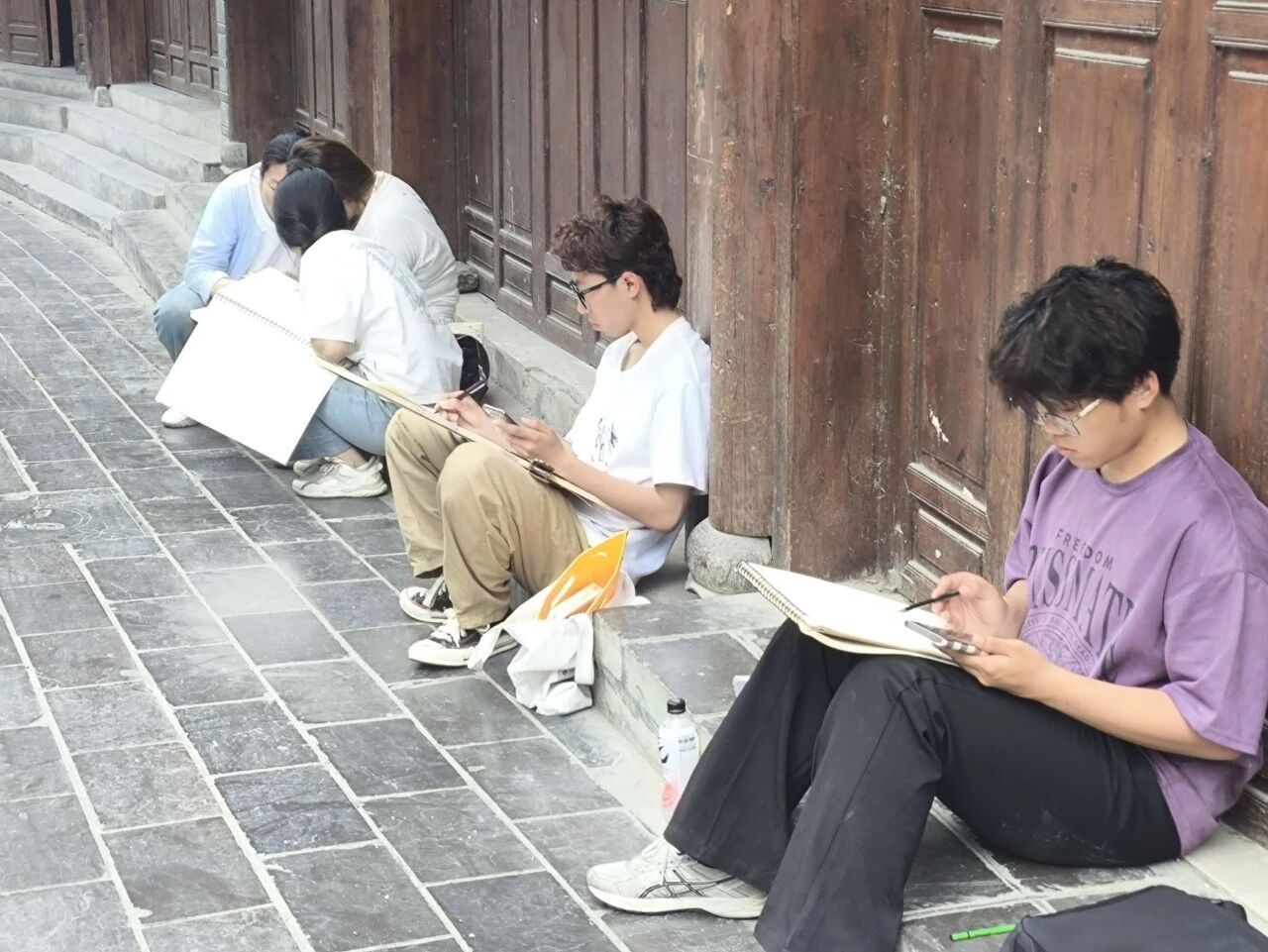 随后,写生团队来到被誉为“中国最美丽小城”的凤凰古城。明清特色民居、回龙阁吊脚楼群、虹桥等文物建筑错落分布,沱江两岸的建筑与自然浑然一体;身着传统苗族服饰的老人、手作传统工艺品的匠人,更成为独特的人文风景。同学们穿梭其中,将古建筑的细节与地域文化的鲜活融入画作。